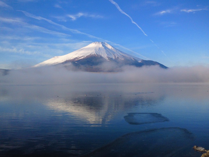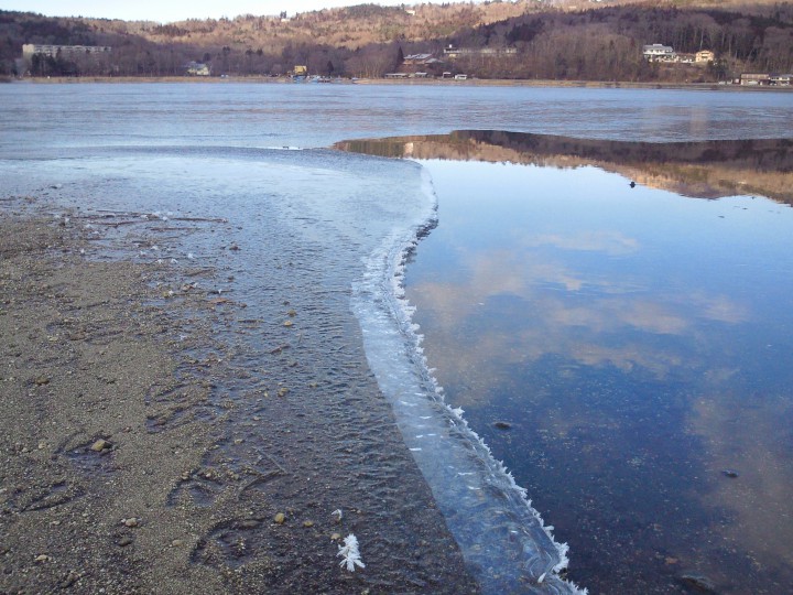 早朝の山中湖は随分氷が広がってきたと思っていたのですが(カメラを持っていなかったので撮影できませんでした)太陽が出ていたせいもあって、溶けてしまったり波で砕けてしまったり…全面結氷までは、まだまだ時間がかかりそうです。13/01/07