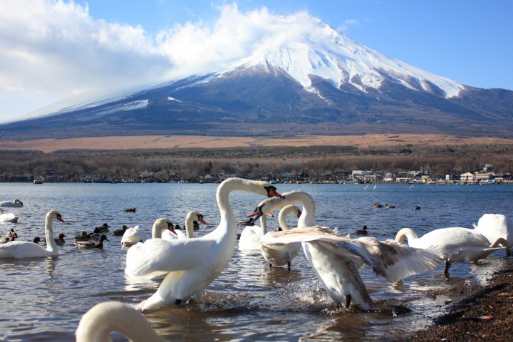 富士山をバックに白鳥と撮ってみました。偶然ですが白鳥同士がケンカ?している最中の写真が撮れました。えさの奪い合いだと思いますが、仲良くして下さいね、白鳥さん。