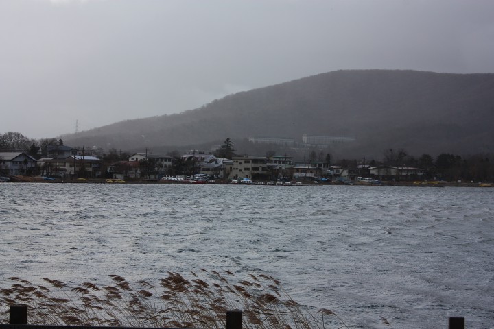 今日の山中湖は風が強く、波がかなりまりました。この時期は手こぎボートでワカサギ釣りを楽しむ人がたくさんいますが、今日は一隻もいませんでした。