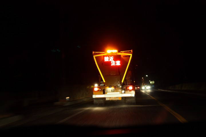 写真は国道138号線、夜間に凍結防止剤を散布車で撒いている様子です。凍結防止剤が撒いてあるといっても注意して運転して下さい。
