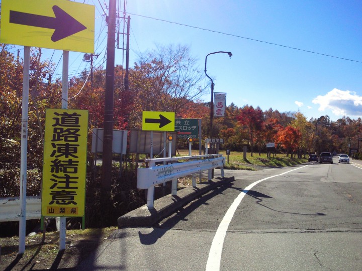 朝晩の気温が零度を下回るのが当たり前となってきた山中湖です。道路にも「凍結注意」の看板が立ててありました。「紅富士」や「ダイヤモンド富士」を見にくる際には防寒とともに、運転される方はお気を付けてお越し下さい。