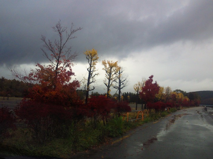 朝からの雨ですが…昨日までの寒さはあまり感じられず、なんだか暖かい気がします。といっても観光客の皆さんはダウンじゃゲットを着用しているので、やっぱり寒いでしょうね。写真は紅葉祭り真っ最中の旭ヶ丘地区の紅葉です。緑・黄色・赤と、絵になる風景です。