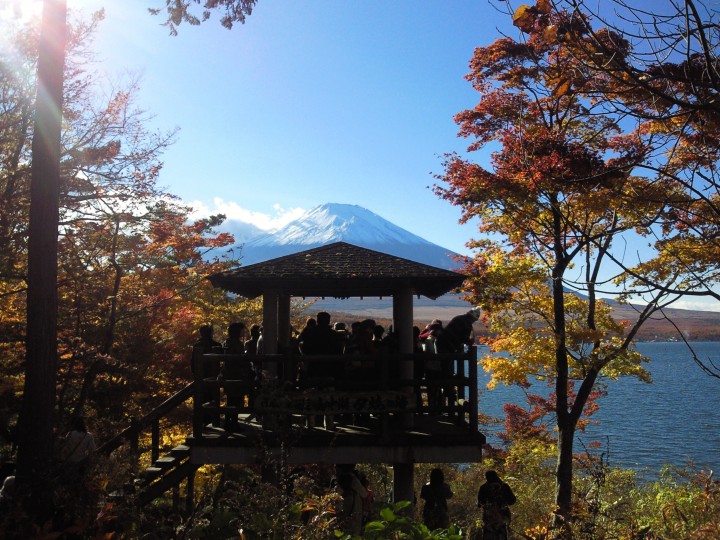 紅葉真っ盛りの山中湖、ただ今開催中の「夕焼けの渚・紅葉まつり」が大盛況です。会場となっている旭ヶ丘地区にある写真撮影ポイント「夕焼けの渚見晴台」もまた人気のスポットです。皆さん富士山と紅葉映える山中湖をこだわりのアングルで撮っていました。この紅葉まつりのライトアップも明日までですよ。