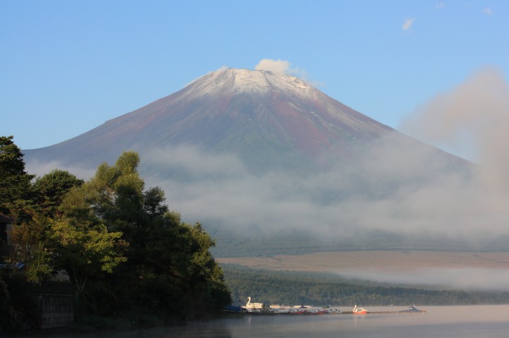 朝6時、富士山を見ると山頂にうっすらと雪がみえました。初冠雪です。左のジグザグの線は吉田口登山道。昨年より12日、平年より18日早いそうです。今日の山中湖は最高気温24℃、明日はこの雪は残っているでしょうか?