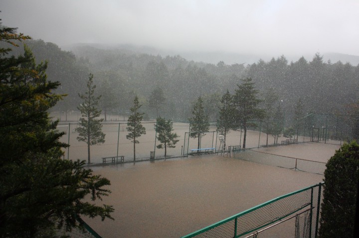 ここしばらく雨が降っていなかった山中湖ですが、お昼に1時間、夕方に1時間、猛烈な勢いで雨が降りました。テニスコートが一瞬にしてプールになってしまいました。