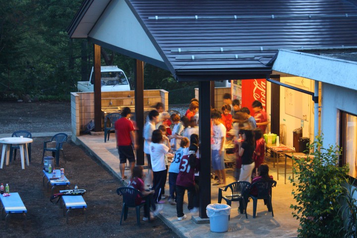 宿泊中のPTAの皆さんは、お楽しみのバーベキューです。練習後に外で食べる焼き肉は格段に美味しいですよね。たくさん食べて明日もテニスがんばって下さい。