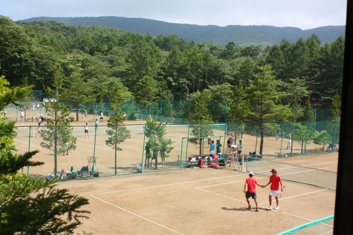 今日も日本列島はものすごい暑さに襲われていますが、山中湖では最高28度で日陰は涼しく、3時頃にはかなり涼しくなりました。最低気温は18℃、夜はヒンヤリです。標高1000mの山中湖でのテニス合宿もいよいよ4日目、明日は最終日です。ケガの無いように集中して練習して下さい。引率の先生方も暑い中、よく生徒さん達を見ています。
