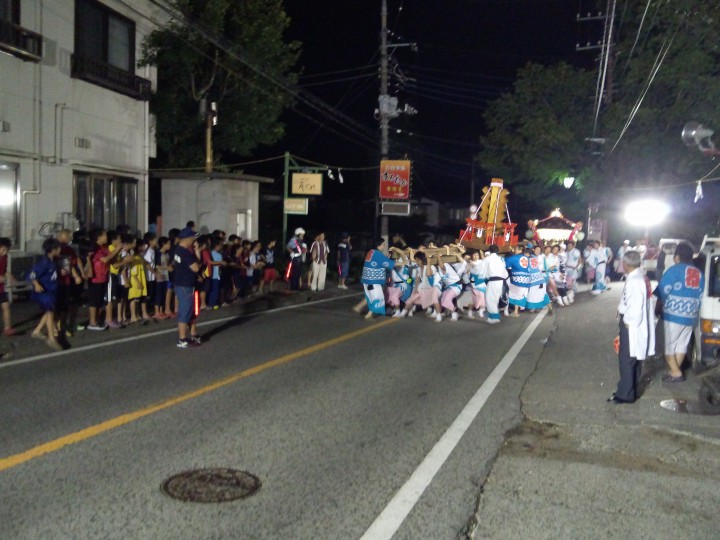 昨日7/14に行われた平野天満宮祭の宵祭りの様子です。午後7時から平野天満宮にて式典が行われた後、御旅所(平野診療所駐車場)まで御神輿が練り歩きます。今年は3連休中に当たり多くの方に見ていただけました。12/07/15