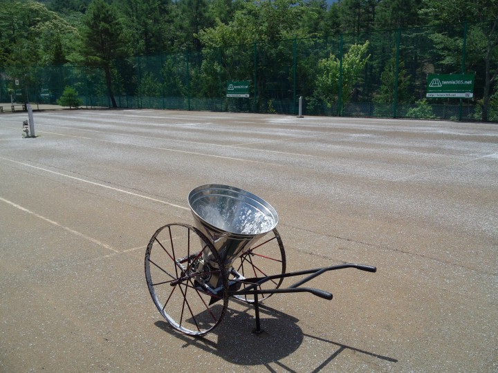 昨日テニスコートに塩化カルシウムを散布しましたが、今日は雨ですので散水作業が省けました。散水作業は、塩カルを土中にしみ込ませるために必要な作業です。シーズン中はコートの状態を見ながら、さらに塩カルを撒いたり散水、化粧砂散布、転圧ローラーを行っていきます。クレーコートの維持管理には手間がかかりますが、この地域ではお互い研究し協力しあって日本一質の良いテニスコートとなるようにがんばっています。このテニスコートでテニスをしてみませんか。