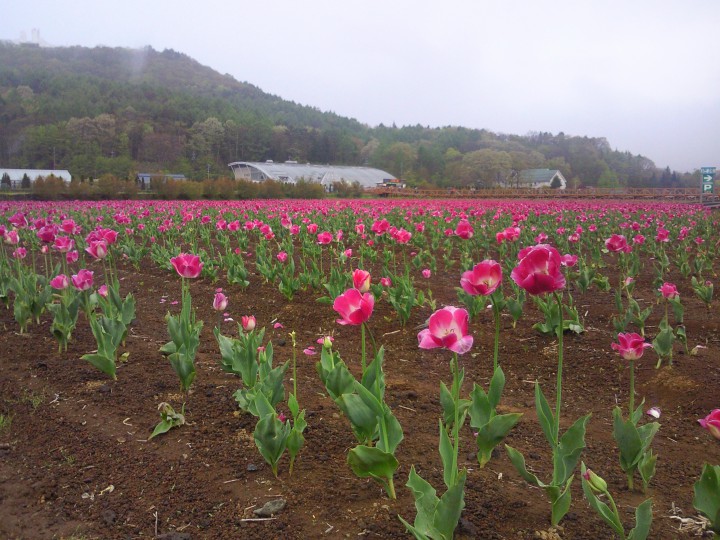 赤、白、黄色のチューリップが見事満開! 数にして約20万本、圧巻です。今日の山中湖は小雨が降り続いていましたが、チューリップは綺麗でした。