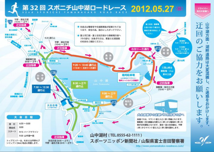 毎年大人気の山中湖ロードレース、今年は5月27日に開催されます。それに伴い、山中湖周辺の幹線道路は道路規制が行われますので、案内を参考にして迂回などして下さい。もう32回目になりますね。目指せ100回です!12/05/18