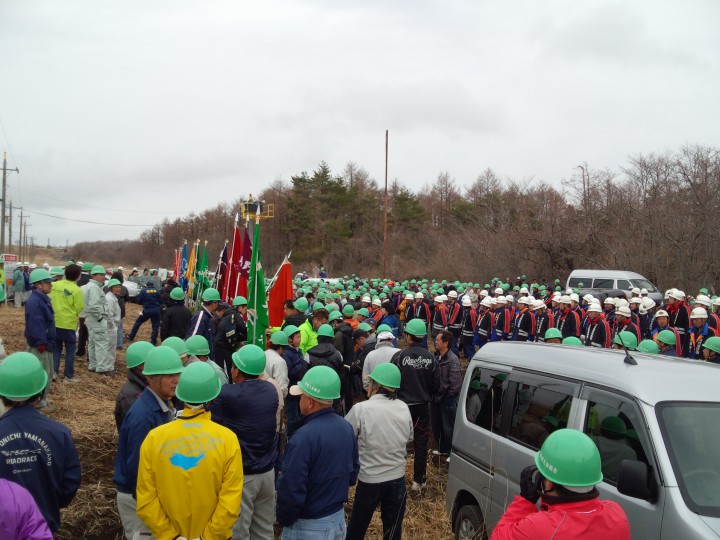 昨日、北富士演習場内の火入れが行われました。山中湖村入会組合全体での作業ですので、参加者は写真の通りすごい人数でした。火入れは9時から行われましたが、前日の雨でススキが湿っていたため、火のつきはイマイチでした。今日は雨、昨日の午後からの雨は日が暮れても降っています。気温7〜12℃、気温以上に寒い1日でした。