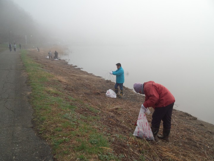 今日は村内一斉清掃の日です。一斉清掃とは、観光地としてふさわしい環境づくりのための村内清掃のことで、みんなで4〜9月の間、朝6〜8時に行っています。平野地区の担当は主に湖畔沿いで、朝方は山中湖に波が立たないので鏡のような水面が美しいです。今朝は霧がかかったなかでの作業でした。
