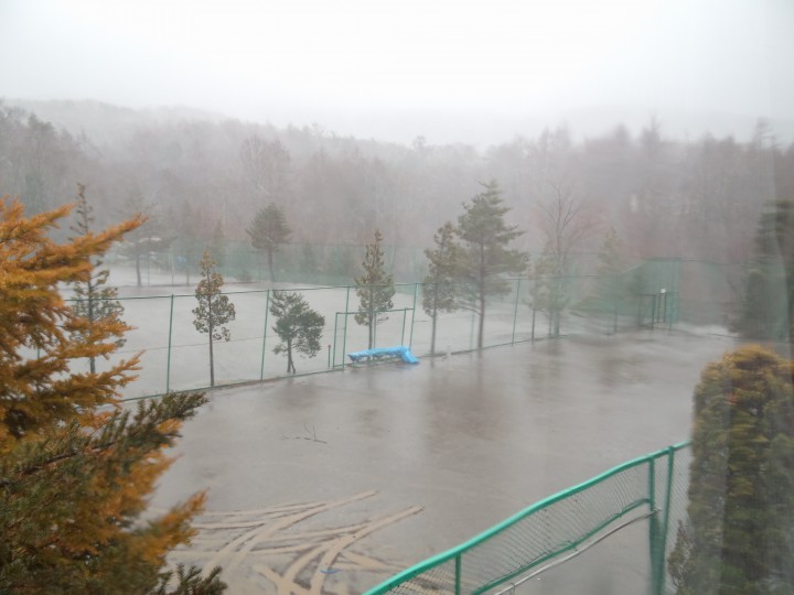 午前中の山中湖は雨や風がすごく、台風が来たみたいな勢いです。最大瞬間風速17(m/s)、写真が白っぽいのは雨で、風を伴って強烈に降り注いでいるのが分かると思います。窓越しで撮影したのですが、窓に吹き付けた雨のせいでゆがんで見えます。