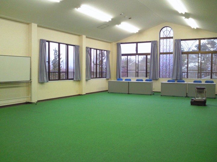 28日から始まる合宿に向けて、ホールの床をカーペットに替えました。かろうじて氷点下になることはありませんでしたが、都内から比べるとまだまだかなり寒く感じる気温です。暖かい服装をご用意してお越し下さい。