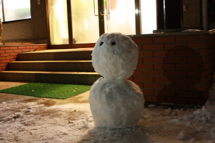 合宿中のお客さんが玄関先にかわいらしい雪だるまを作りました。何を見ているんでしょうね。〜去年の雪だるまは2011/03/04のお知らせに載ってます〜