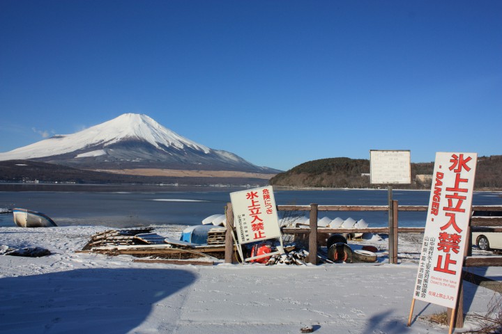2月7日より氷上への立ち入りを見合わせていました山中湖ですが、2月16日をもちまして今シーズンの立ち入りが禁止となりました。まだ、平野地区の一部が結氷していますが、氷がもろく非常に危険ですので絶対に立ち入らないようにしましょう。