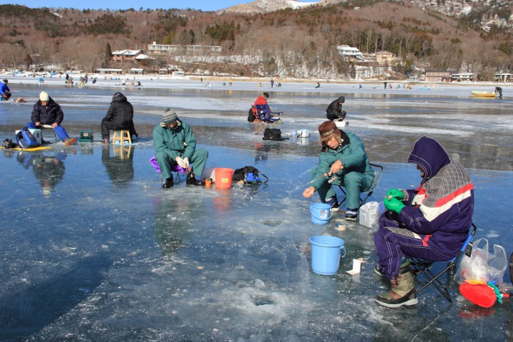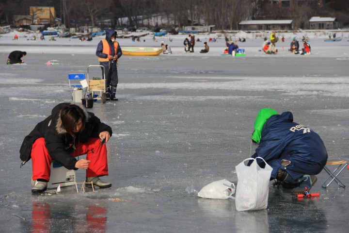穴釣りが解禁されて今日で4日目を迎えました。朝から曇り空で最低気温は-7℃と暖かく、かなり薄着で穴釣りをしている人もいまいした。釣果はまずまずのようです。写真は8時、平日にもかかわらず釣り客約200人、賑わっていました。