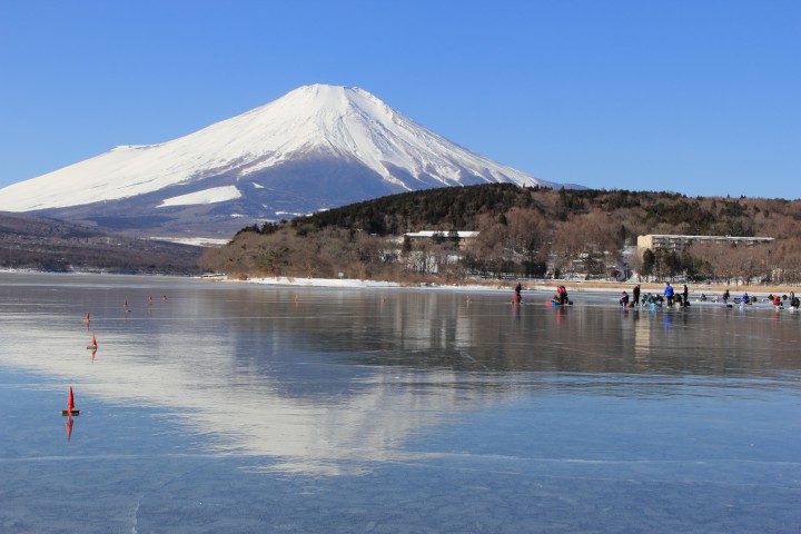 山中湖平野ではワカサギ穴釣りが大盛況です。日の出から11時までの限定ですが、土曜日ということもあり初日の昨日よりも賑わっています。山中湖に来ましたら氷上へ上ってみてはいかがでしょうか。立ち入りOKの範囲は赤旗内です。