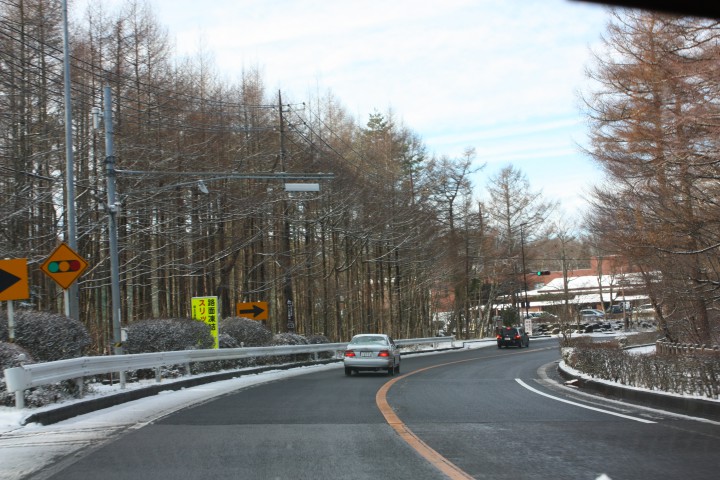 ついに初雪です。積雪は2?ほどで辺りがうっすら白くなりました。昼には太陽が出て日向の雪は溶けましたが、日陰には雪がまだ残っています。気温も12時に-1℃ですが夜はさらに冷え込む予報、路面凍結注意です!車でお越しの際はくれぐれもお気を付け下さい。写真は13時、雪がやんだ後の国道413号線です。24時の気温は-8℃、道路が凍っていますのでスリップ注意です。