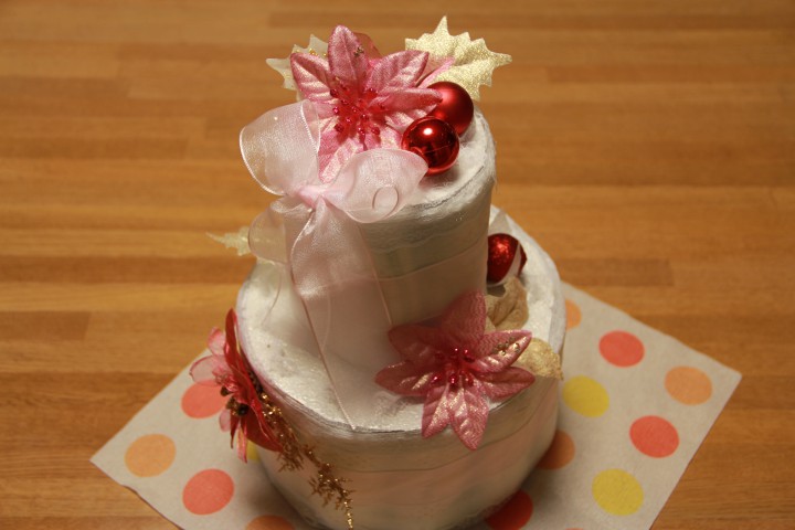 ダイパーケーキ(おむつケーキ)知ってますか?出産祝いにオムツをケーキのようにデコレーションしたものをプレゼントするらしいのです。知人の出産祝いにと、見よう見まねで作ってみました♪ 直径18cm、Sサイズのオムツ30個くらいで出来ました。