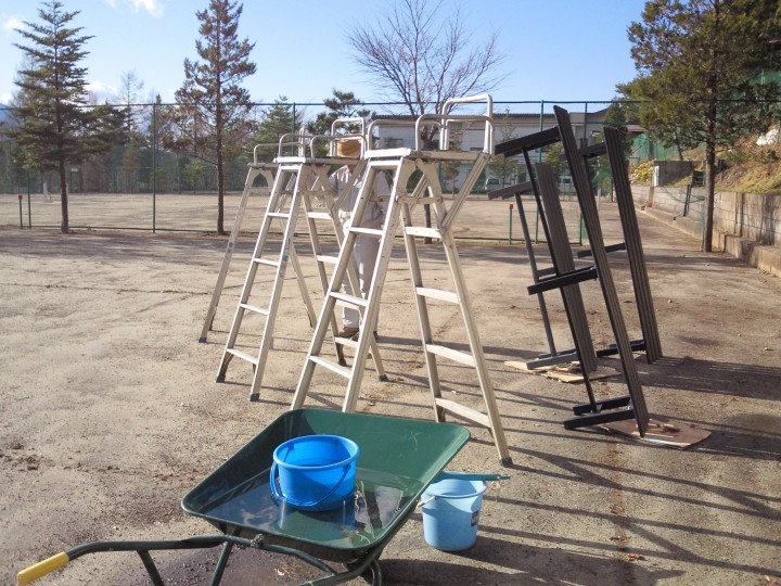 昨日のラインテープの撤去に続き、今日はテニスコートの備品の片付けです。約半年間、外に置きっぱなしの審判台やベンチを綺麗に洗ってから倉庫に。来春までお休みです。