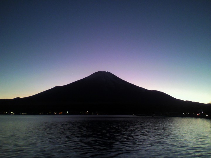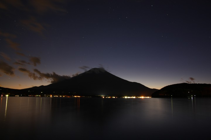 山中湖平野の日没はPM4時頃、写真はPM5時40分に撮りました。かなり暗くカメラマンも自分一人だけで、ペンライト片手に寒い中、富士山を撮りました。ピント合わせに苦労しましたが綺麗な富士山が撮れました。