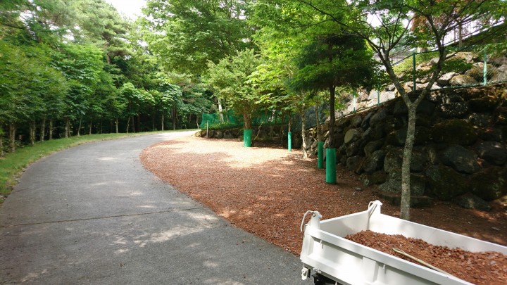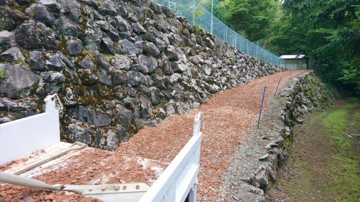 NO.7コートからNO.8-10コートへ向かう連絡路に砕いたレンガを撒きました。雨が降った時に土が流れない様に以前砕石を撒いたのですが、その上に薄く撒きました。よりぬからずに、きれいな色になりました。