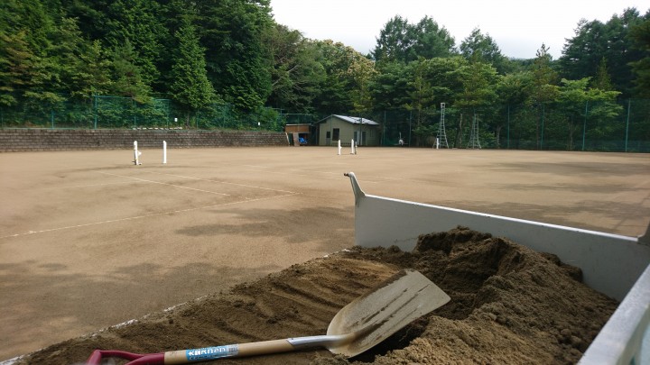 今日はテニスコート作りの仕上げとして、化粧砂を撒きました。均等に撒いた後は、ブラッシングを縦横掛けて、ローラー転圧します。当館では、化粧砂撒きは薄く2回撒いています。いい仕上がりになっています。