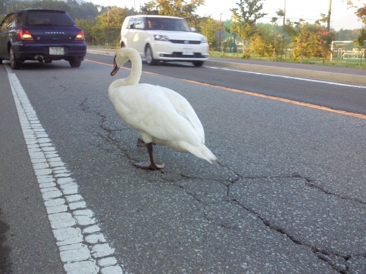 車を走らせていると、道路に白鳥が歩いていました! ぺったん、ぺったん周りの車もお構いなしで歩いていました。湖から結構な距離があるのですが、どうやら近くの川から上がってきたようです。時間もなかったので、その後その白鳥がどこにいったのか、無事湖まで歩いて(飛んで)行ったといいのですが…。