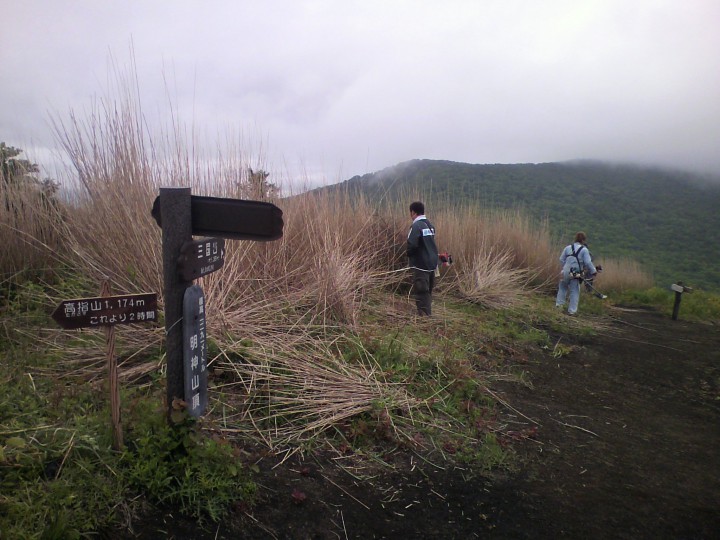 今日は平野旅館民宿組合青年部による「東海自然歩道の下刈り」が行われました。毎年この時期に青年部とそのOBの20名ほどで、山中湖平野地区の東海自然歩道(三国峠〜鉄砲木ノ頭(明神山)〜高指山〜石割山)を整備しています。この辺りは、標高差が少ないため,東海自然歩道の中で最も手軽に歩けるコースになっています。また富士山や山中湖が一望できるのでお勧めです。写真は、標高1291mの明神山頂、案内看板付近です。