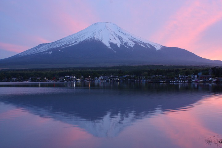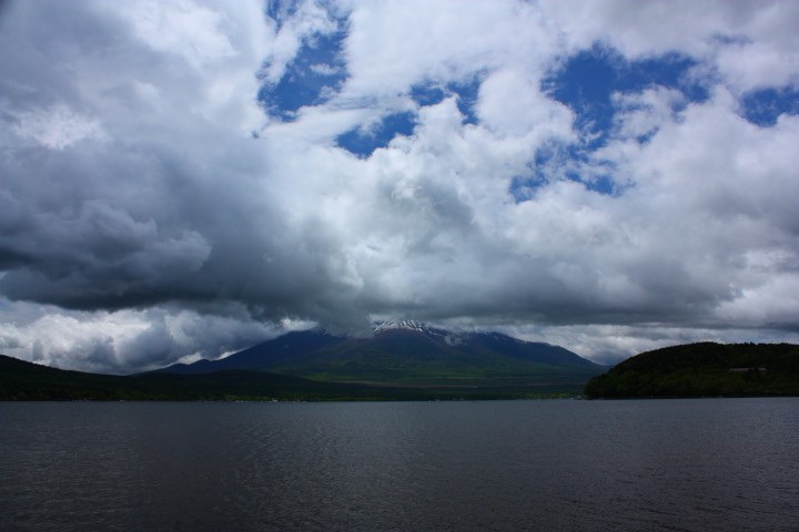 写真はAM9時、ちょうど雨が上がったばかりの富士山です。まだ黒い雲がありますが、山中湖は波もなくとても静かで、この後だんだんと明るくなっていきました。