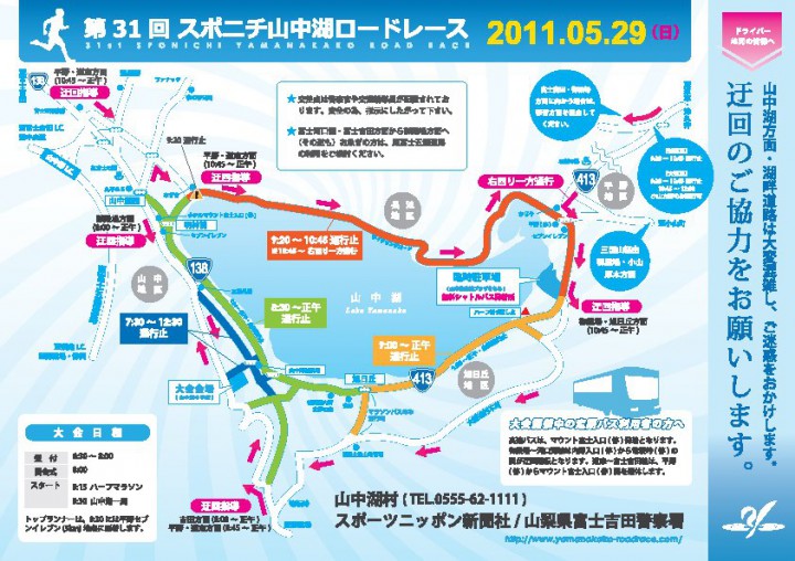 明後日5月29日(日)は山中湖ロードレースが開催されます。この大会も今年で31回、種目は山中湖一周(13.5km)とハーフマラソン(21.0975km)、参加人数1万人以上の名のある大会です。 山中湖を一周する道路を使用するため、交通規制がひかれます。ドライバーの方には大変ご迷惑をおかけしますが、迂回のご協力をお願いいたします。参加される皆さん、天候が心配ですが頑張って下さい。交通規制:2011年5月29日(日)7:30〜12:30