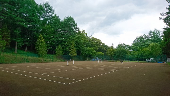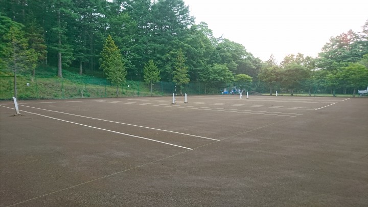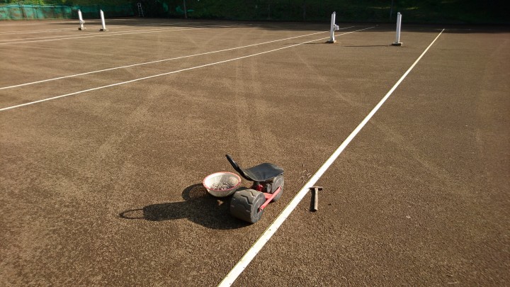昨日に続いて、今日もNO.8-10コートのラインテープ張りです。他にも仕事があるので、少しずつの作業になります。地道に丁寧に取り付けようと思います。NO.1〜7コートはローラー転圧しました。ピカピカです。