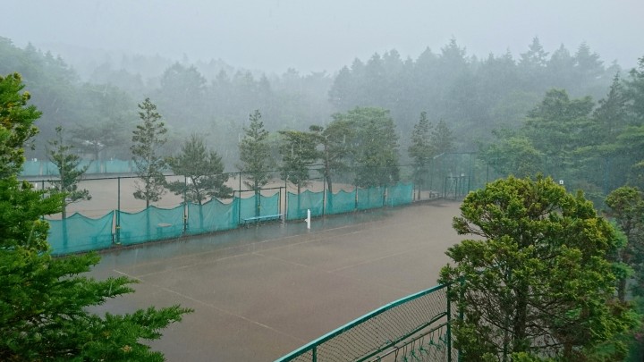 午前中は曇りだった山中湖、午後1時30分から突然大雨が降ってきました。外仕事をして、遅い昼食でしたので、雨に濡れはしませんでしたが、テニスコートは写真の通り、プールになりました。この後、雨は降り続きました。梅雨らしい1日でした。