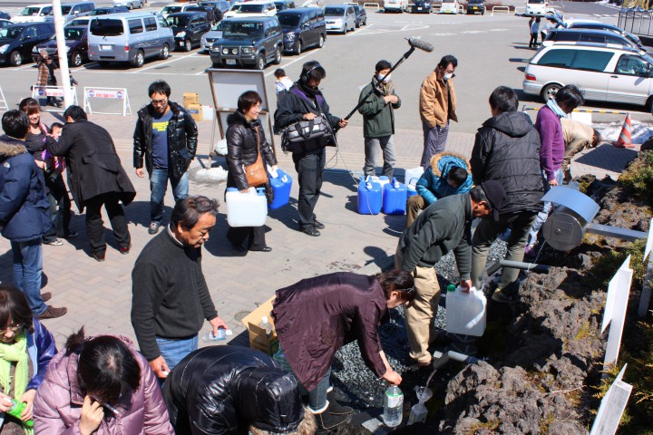 山中湖から車で20分、「道の駅富士吉田」で誰でも無料で天然のミネラルウォーターを汲んで帰ることが出来ます。富士山の天然水は、バナジウムを多く含み、口当たりはまろやかでとってもおいしいですよ。今日もたくさんの人が水を汲みにきていました。容器は販売していないので、空のペットボトルなどの用意を忘れずに。テレビ朝日が取材に来ていました。?計画停電:平野は対象外ですが、みんなで節電中です。共立テニスロッヂは営業しています。