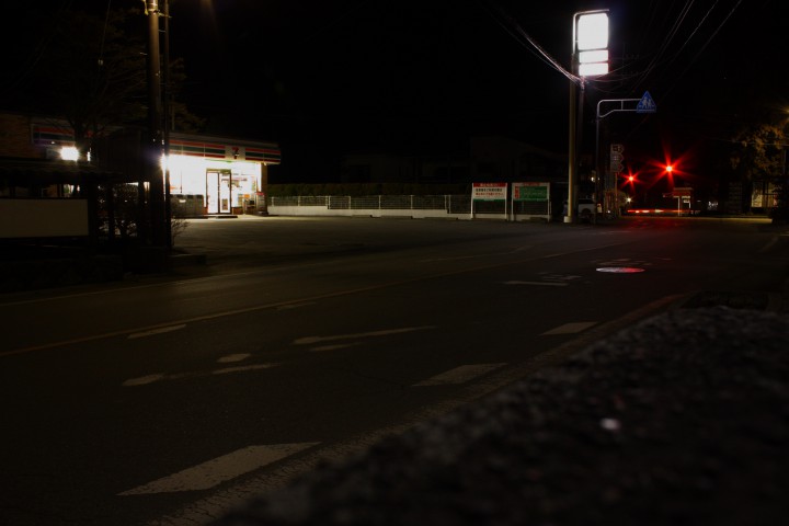 pm8:00の平野バス停前の写真です。写真の撮り方で明るく写っていますが、どこも節電中でかなり暗くなっています。セブンイレブンも蛍光灯を半分点灯以下にして節電していました。