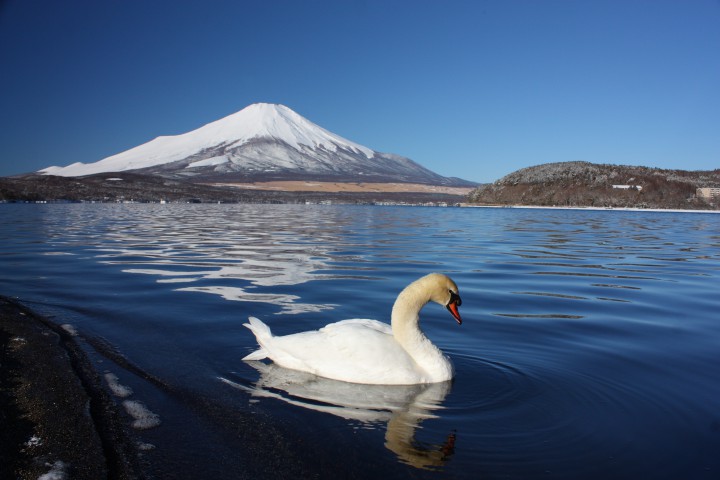 今日は朝からとっても良い天気です。山中湖の白鳥は野生にもかかわらず、人慣れというか、人を警戒しないのですごく近くで見ることができます。(以前、湖前の道路を横断してました!)冬の湖はとっても澄んできれいなので、逆さ富士も簡単に撮ることが出来ますよ。