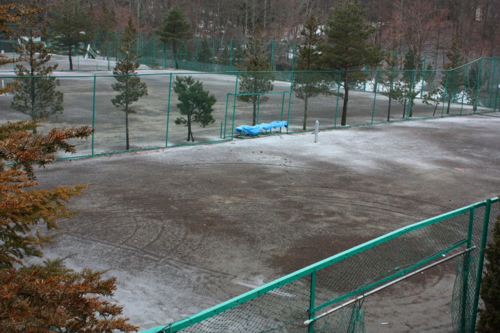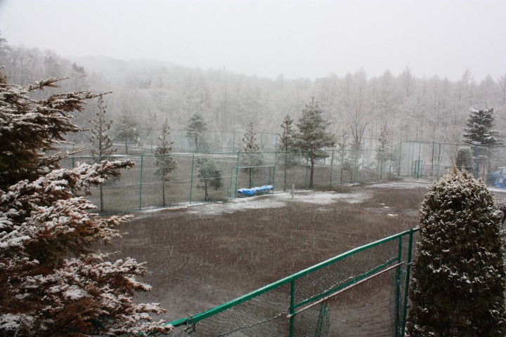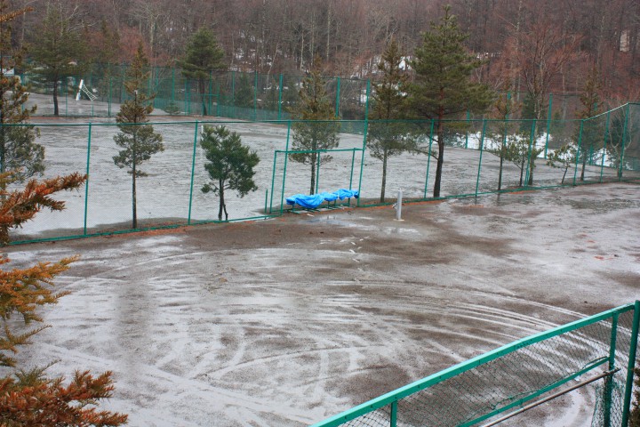 久しぶりに寒い1日となりました。写真は午後4時、共立テニスロッジのテニスコートです。朝から降っていた雨はみぞれに変わり、少しずつ白くなっていきました。明日も1日寒そうです。暖かい格好でお越し下さい。気温4〜-3℃。