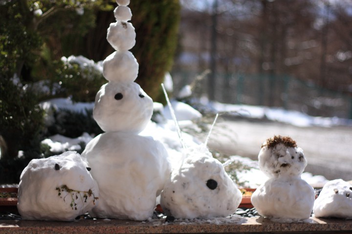 昨日降った雪は、結局10cmも積もりました。そのおかげで、合宿中のお客さん達がこんな微笑ましい雪だるまを作ってくれました(とってもかわいかったので、思わず撮ってしまいました)。今なら共立テニスロッヂの玄関前で、この雪だるま達がお出迎えしてくれますよ!道路は、日中晴れましたのでほとんど乾いていますが、朝晩は凍っているので車は注意です。