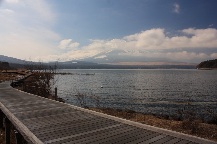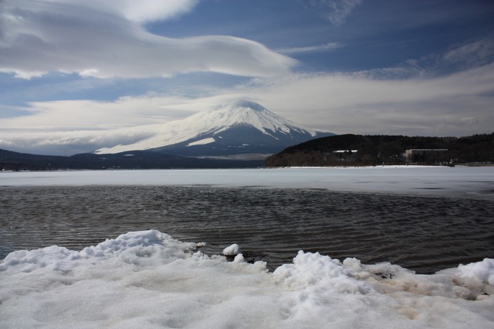 12時現在、富士山に笠雲がかかっていました。天気予報通り、天気は下り坂のようです。富士山にかかる雲の様子で、天気予報ができるんですよ。なんでも、笠雲の出た当日または翌日に、雨の降る確率は72%らしいです。気温-3〜7℃。?山中湖:平野地区は結氷、氷上全面立入禁止