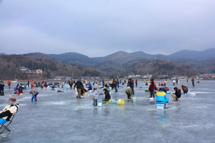 朝9時、平野地区氷上はワカサギ釣りの人ですごい賑わいでした。500人はいたのではないでしょうか。スピードスケートを楽しんでいる人もいて、懐かしかったです。30年ぶりの光景でしょうか?天気は薄曇り、気温2℃、ダウンジャケットがないと寒い陽気でした。気温-8〜6℃。