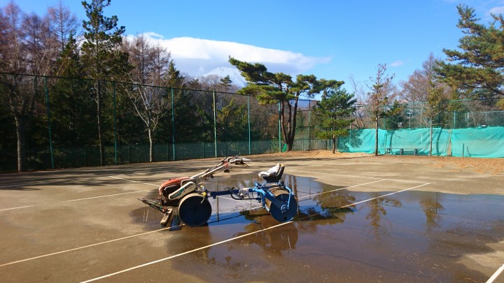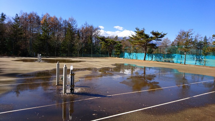 今日はテニスコートのスプリンクラーの水抜きを行いました。寒さが厳しい山中湖では水抜きを行わないと、凍結により配管が破裂してしまいますので、毎年この作業を行っています。プチ逆さ富士になりました。