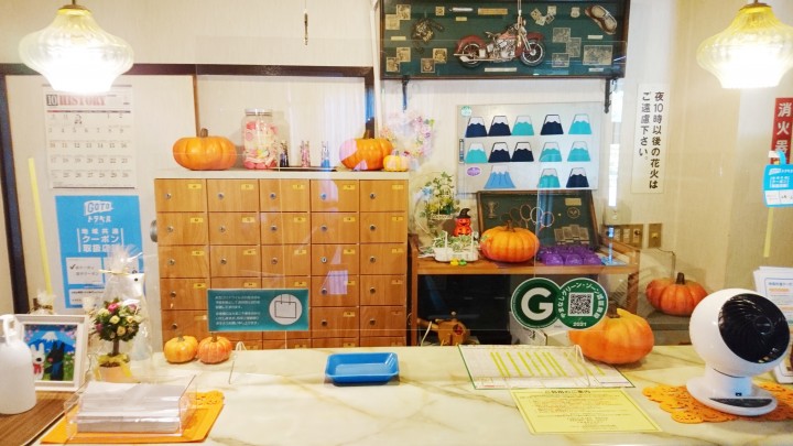 ハロウィンは毎年10月31日。すっかり秋のイベントとして定着したハロウィン。明日から10月ですので、フロント周りをハロウィン仕様に飾付してみました。オレンジカボチャが多いですが、雰囲気はハロウィンです。少しでも楽しんでもらえたら嬉しいです。