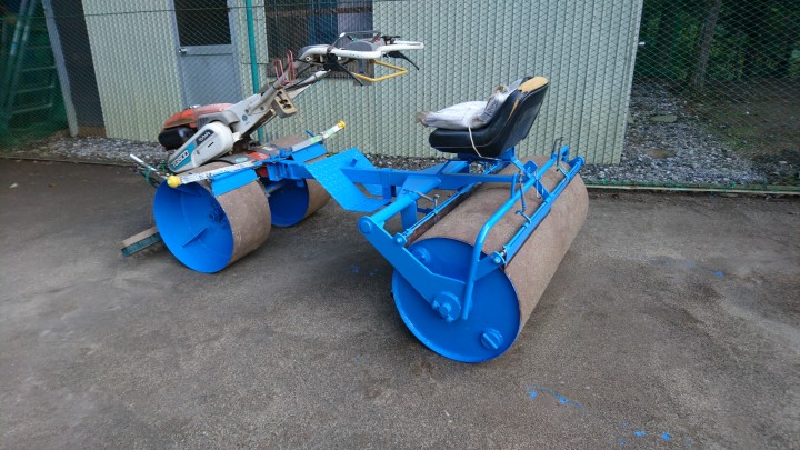 No.8〜10コートの転圧用ローラを塗装しました。高圧洗浄機できれいに水洗いし、さび止め塗装後に青色で塗装しました。塩化カルシウムを使用してテニスコートを転圧しているので、錆び錆びのローラーでしたがきれいになりました。自分で塗るととても愛着がわきます。