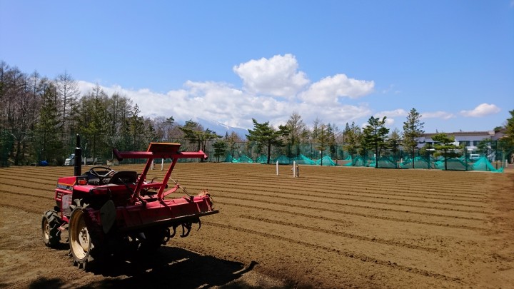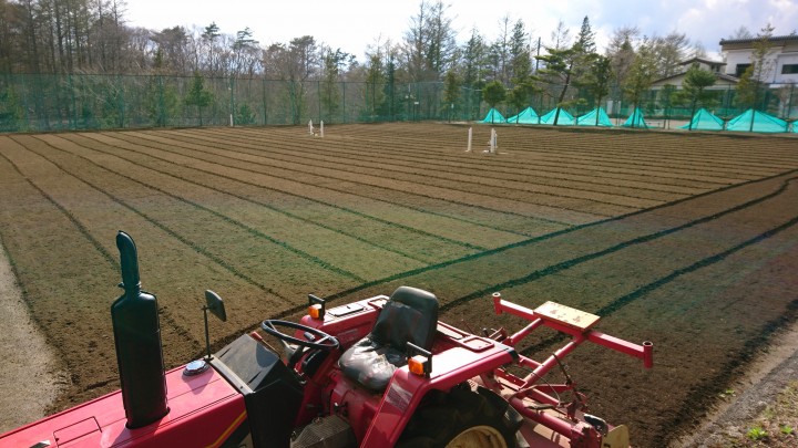 今日は?5〜7コートの3面をトラクターで掘り起こしました。朝から天気も良く、朝10時、コートも乾いたので、富士山を見ながらの作業でした。この後、軽いローラー&重いローラー転圧、アングル掛け&重いローラー転圧をして今日の作業は終わりました。転圧はゆっくり丁寧に行う事で、より平らに仕上がります。今日の最高11℃最低-2℃