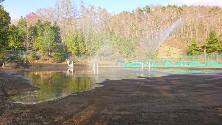 今日の山中湖は曇。予定では?5〜7コートの掘り起こし作業でしたが、太陽が出ていないため断念しました。写真は昨日の物ですが、強風が吹いたためにスプリンクラー散水して砂が飛ばないようにしました。午後3時から2時間散水して、コートから水があふれるまで撒きました。表面の砂が吹き飛ばなくてよかったです。