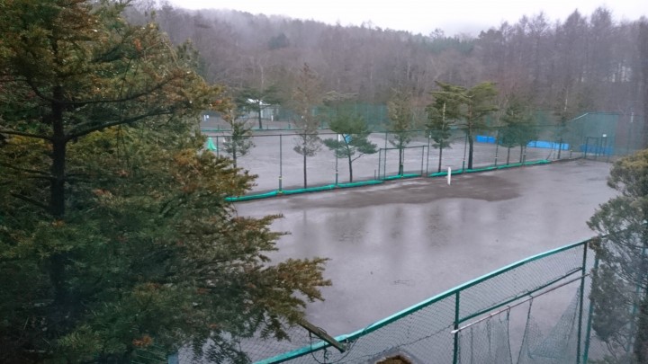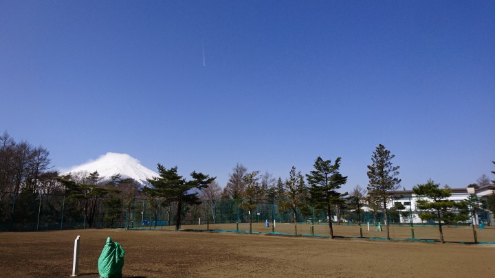 今日の山中湖は晴れ、いい天気の1日でした。最高気温は11℃、最低-3℃。写真はpm4時20分のテニスコートです。雪は全くありません。天気次第ですが、今月末にはトラクターで掘り起こす予定です。