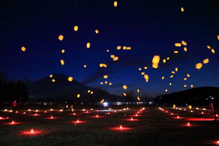 昨日開催された「山中湖アイスキャンドルフェスティバル」で、平野民宿組合青年部が同時開催したスカイランタン。冬花火の合間に100個、上空にぷかぷかとクラゲのように上がっていきました。とても面白く楽しかったです。明るい綿帽子のようでもあり、凧揚げみたいでした。来年も行われるイベントだと思いますので、ぜひご参加くださいね。終了後はすべて回収し、希望者にはお持ち帰り頂きました。ゴミが全くでない素晴らしいイベントです。