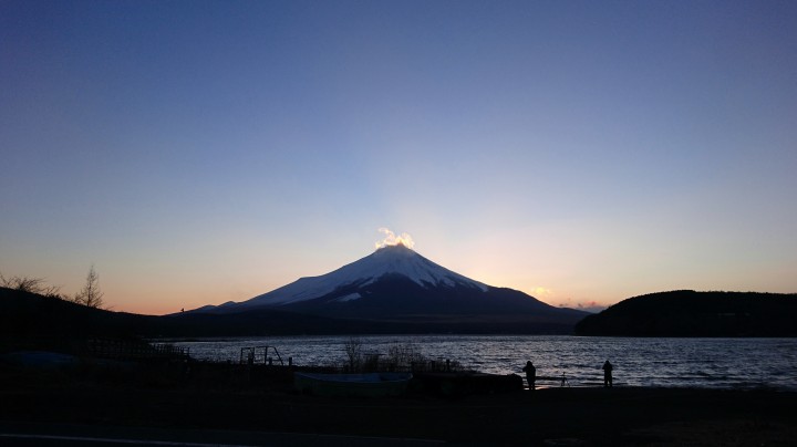 今、山中湖はダイヤモンド富士ウィークです。午後4時30分頃の時間帯に平野から見えます。写真は午後5時20分、ダイヤモンド富士には全然間に合いませんでしたが、きれいなシルエットの富士山が撮れました。今日の山中湖は晴れ、最低-3℃最高7℃。夜は強風ですので、飛散物には注意して下さい。